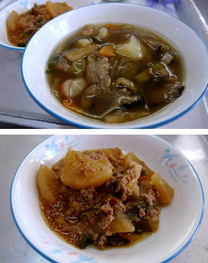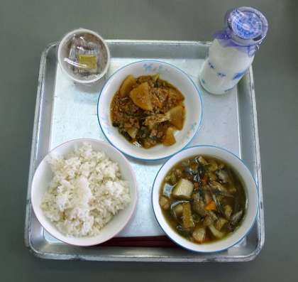 今日のメニューは、のっぺい汁、大根と豚ひき肉の甘辛しょうゆ炒め、麦ごはん、牛乳、そして納豆です。(写真 1)