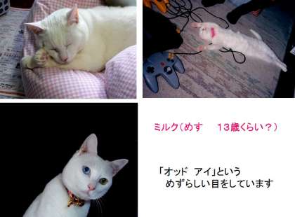 なかなか飼い主が見つからなかった理由は、ミルクのその独特の目にあったのです。実はミルクは左右の目の色がちがうために気味悪く思われていたようです。人間だったら「友だちから 目のことでからかわれたりしないかな・・」と心配になりますね。でも、ミルク本人(?)はまったく気にすることもなく、いつものんびりひなたぼっこをして暮らしています。