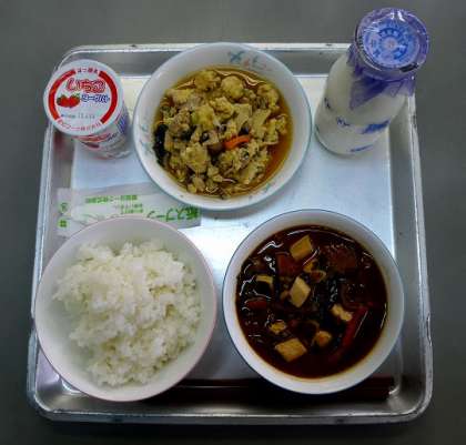 今日のメニューは、五目みそ汁、親子煮、ごはん、牛乳、いちごヨーグルトです。(写真 上)