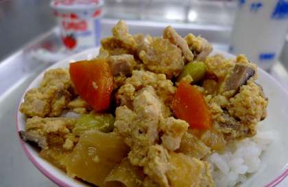 親子煮には、玉子、鶏肉、タマネギの他に、にんじん、しいたけ、こうや豆腐、えだまめなど具だくさんのおかずです。私は、親子煮をごはんにのせて「親子どんぶり」にしていただきました。(写真 中)