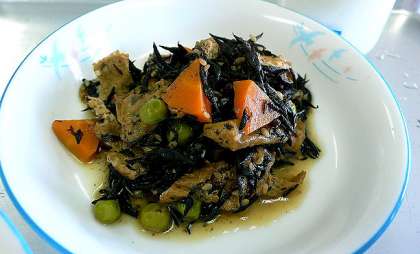「ひじきの香り炒め煮」は、主役のひじきのほかに、にんじん、油あげ、枝豆などの材料がごま油で炒めてあります。仕上げにゴマもふりかけてあるのでごまの風味満点です。(写真 下)