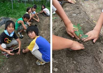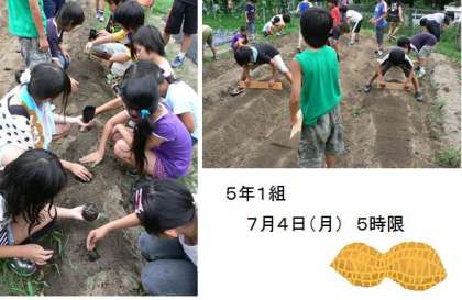 7月4日(月)、5年生は落花生(らっかせい)の苗を学級園に植えました。