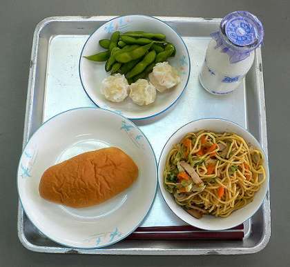 今日のメニューは、冷やし中華、シューマイ・枝豆、小型ロールパン、牛乳です。(写真 上)