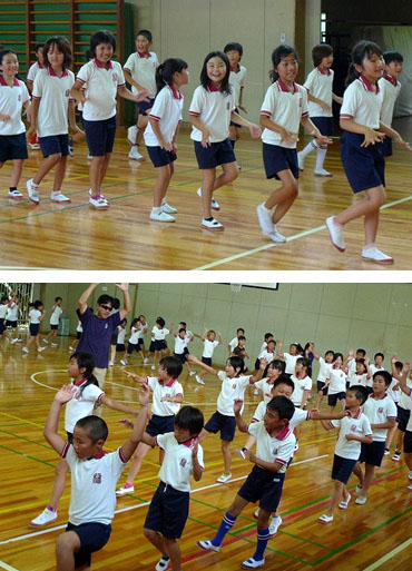 7月8日(金)の5時間目、3、4年生は「ごんか祭り」を企画する加藤憲起さんら3名の講師をお迎えして、「ごんかサンバ」のダンスレッスンを受けました。