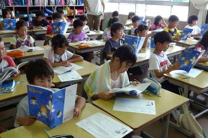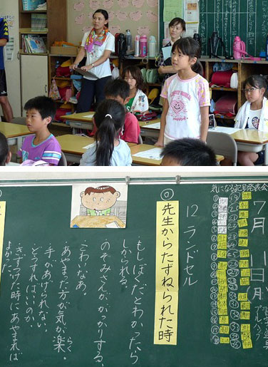授業の後半、道徳の教材「明るい心」が配布されて、子どもたちは興味津々で話のエンディングを読みます・・・