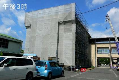 午前中に骨組みだけだった足場も午後にはごらんのようにシートでおおわれました。(写真 中・下)