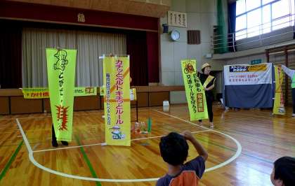 最後はここまで進行役だった光昭先生が登場して、交通信号の「赤」「青」「黄」の3色のリボンをつかった交通安全マジックを披露されました。