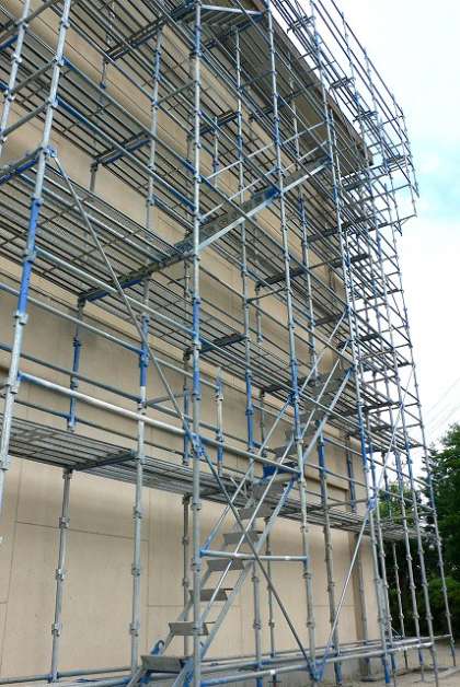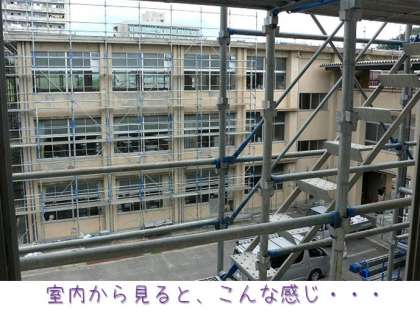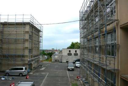 校舎南館(本館)の北側にも足場が組まれました。職人さんの作業は実に手際よく、はいですねぇ。