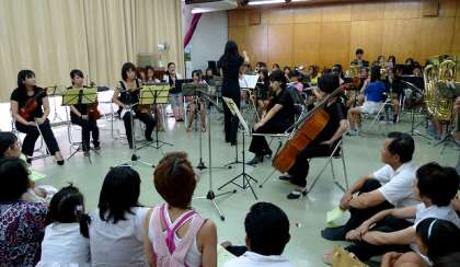 八幡小学校・音楽部の子どもたちも頑張りました。宮田さんと共演できてよかったね!ステージでは舟橋(ヴァイオリン)、小倉、水野(クラリネット)、加藤(パーカッションサポート)など指導者の姿も見られました。