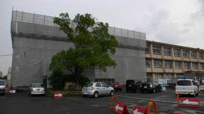 25日(月)、いよいよ校舎(本館)南面もシートで覆(おお)われはじめました。職員室で働くものにとっては夏の日差しをやわらげてくれるのでうれしいのですが・・・(写真 上)
