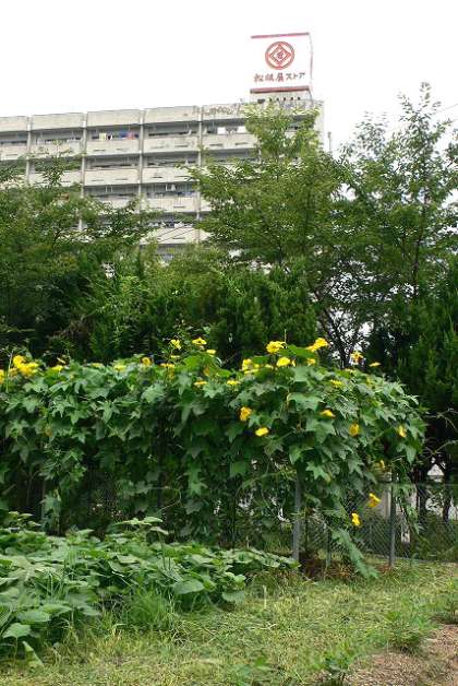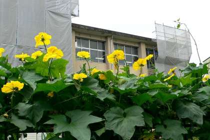 耐震補強工事が行われている校舎を背景にして、咲きほこるヘチマの花を撮影してみました!(写真 中)