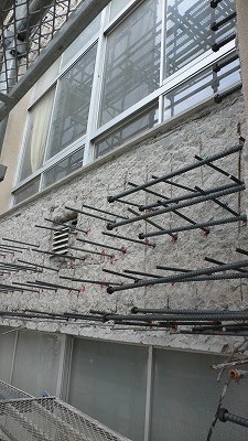 2階教室の壁面には実にたくさんのアンカーが打ち込まれています。ここに鉄骨ブレースを接着して固定されるのですね。(写真 1、2)