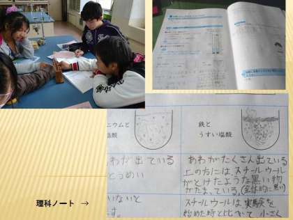 試験管の中の「アルミニウム」や「鉄」が塩酸にふれると、あわをだして溶けていくことや特有のにおいがでることがわかりました。福留教諭の指示で子どもたちは、観察して見つけたことをノートにまとめていきました。