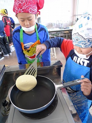 ホットケーキの生地ができあがりました。いよいよフライパンでの調理です。火加減をたしかめて生地を流し込みます。