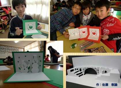 台紙の色は、赤、みどり。自分の好みの色を選んで作品と接着します。メッセージを入れて家へ持ち帰ります。