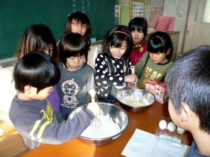 今日は,1時限目に教室でケーキ作りをしました。粉をまぜて,卵を割って,さつまいもを入れて・・・炊飯器のスイッチをon!(写真 1・2)