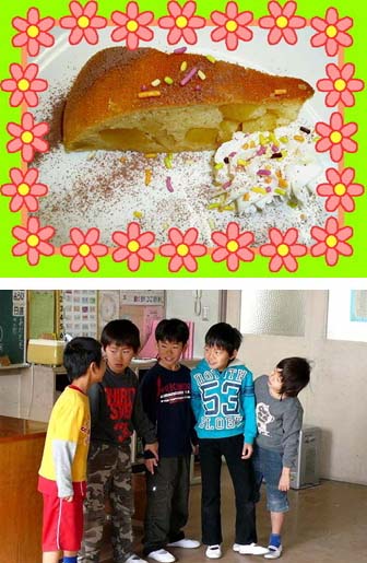 ケーキの完成は3時限目にぴったり間に合いました。ホクホクのケーキに包丁を入れて,生クリームと,カラ—スプレーと粉砂糖(チョコ)をまぶして完成です。(写真3)