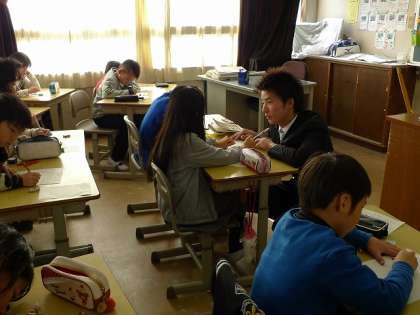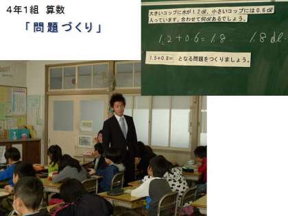 12月21日(水)の3時限目、愛知教育大学4年の須田さん(数学科)による算数の研究授業が4年1組(担任 小山教諭)で行われました。須田さんは年末に卒業論文を書き上げ、規定の単位を取得して、大学を卒業できれば、4月には岐阜県内の学校の教壇に立つことになります。彼にとってこの授業は、大学での研究成果を現場で実践するチャンスであると同時に「第3の教育実習」の機会でもあります。