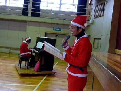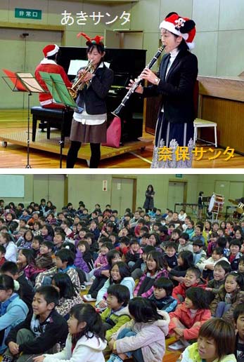 つづいて登場したのは、「あきサンタ」と「奈保サンタ」です。二人は「佳世サンタ」のピアノ伴奏をバックに、トランペットとクラリネットで♪サンタが町にやってくる を演奏しました。