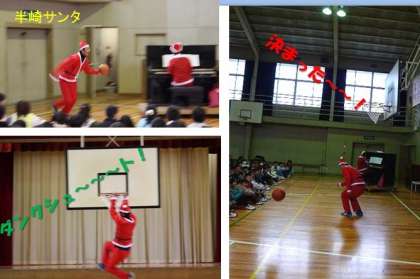 そして、そして・・今度は男性のサンタクロースのようです。子どもたちが呼びかけると、「半崎サンタ」がバスケットボールをドリブルしながら、空中に舞い上がったかと思ったら・・・ダンクシュートを決めたのです。