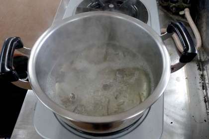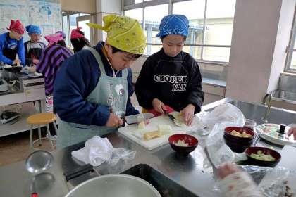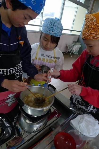 大根にも火が通り、油揚げ、味噌の投入です。味噌のとかし方もグループによってさまざまです。