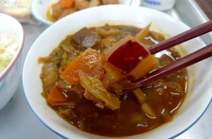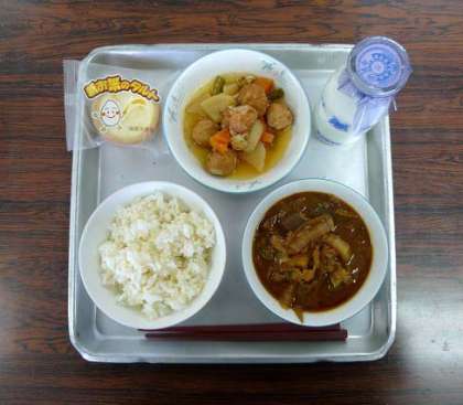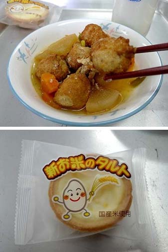 今日のメニューは、さつま汁、鶏団子と大根の煮物、発芽玄米ごはん、牛乳、お米のタルトです。
