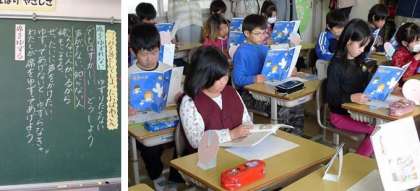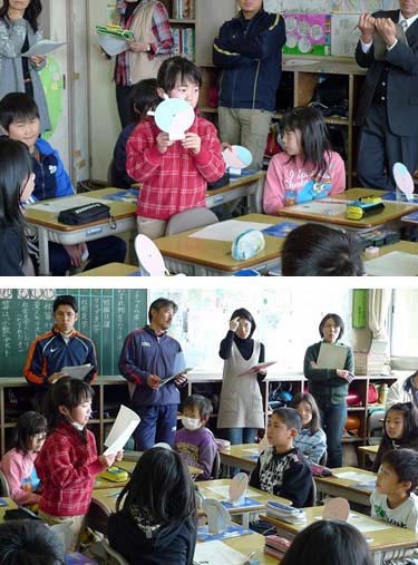 友だち意見を発表するときには、かならずその人を見て聴く・・というルールもすっかり定着してきました。この一年で子どもたちは自分の気持ちや考えを素直に発表したり、文章の形で表現できるようになってきたなぁと子どもたちの成長と洞口教諭の指導技術の向上に感心させられた瞬間でした。(写真 1・2)