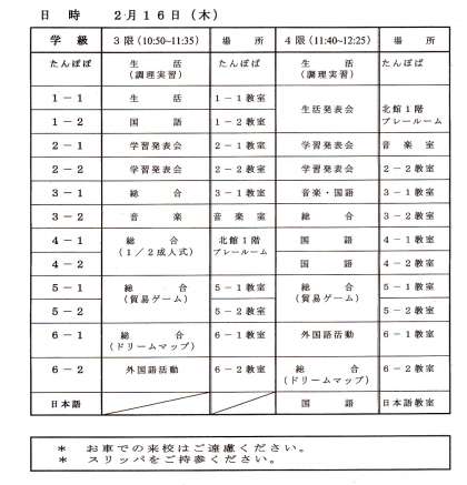 本日(16日)の3〜4時限に授業参観を行います。公開授業の教科・内容や会場は下記のとおりです。子どもたちの成長した姿をご覧いただければ幸いです。