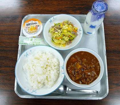 今日のメニューは、ハヤシシチュー、イタリアンサラダ、ごはん、牛乳、だいだいのムースでした。
