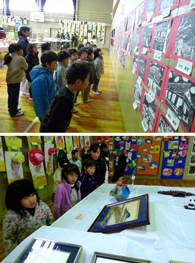 校内作品展ではただ作品を展示するだけでなく、子どもたちにとっては友だちや地域のみなさんの作品を鑑賞するチャンスでもあります。