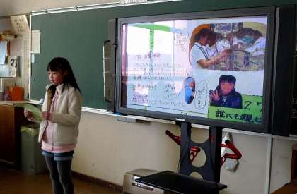 6年生は「ドリームマップ」の発表を行いました。子ども1人ずつが前に出て将来の夢について語りました。大型テレビのモニターには、制作したマップが映し出されます。