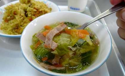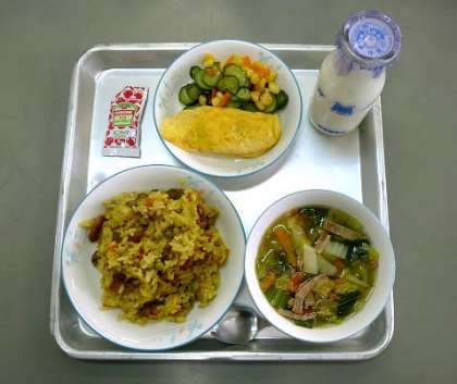 今日のメニューは、白菜とベーコンのスープ、オムレツ・ミニフレンチサラダ、カレーピラフ、牛乳、小袋ケチャップでした。