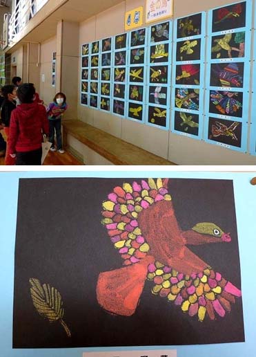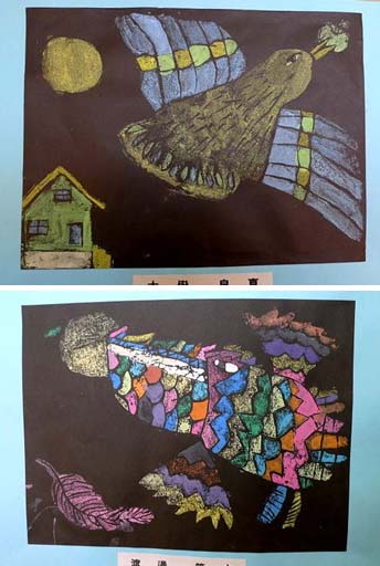 4年生は「金の鳥」というお話の感想を版画(多色刷り)で表現しました。