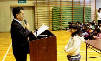 今日の集会は、まずはじめに「家庭の日 県民運動啓発ポスターコンクール」で努力賞に選ばれた山中さん(2年生)の表彰がありました。