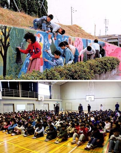 八幡小学校創立から10年以上が経過した1980年代の中頃、校門からスロープにかけての壁面の老朽化がすすんでいました。その頃、6年生と職員から「壁面を児童のデザインした絵で飾ろう」という声があがり、一大プロジェクトとなりました。記録写真をもとにして、その当時の作業風景やその頃の子どもたちの熱い想いが紹介されました。