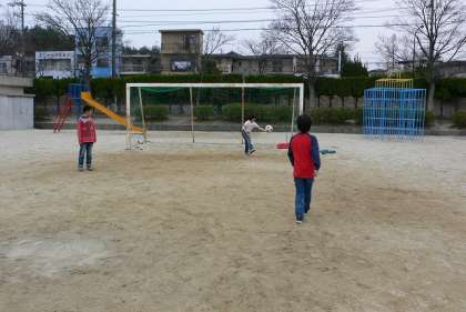 運動場では、帰宅後に再び学校へやってきてサッカーを楽しむ子どもたちの姿が見られます。