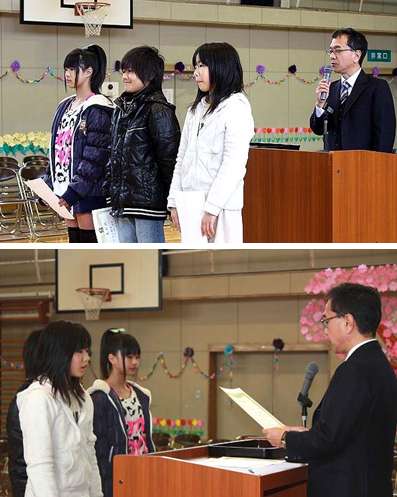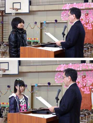 修了式につづいて、小学校生活6年間・皆勤を達成した3名の児童の名前が紹介され、浅井校長より一人ずつ、表彰状が授与されました。
