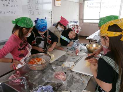野外活動の班を2つのグループに分け、1つは、加藤暁先生指導のもと、家庭科室でカレー作りを行いました(写真上)。もう一つは、運動場にレンガで炉を作り、半崎先生指導のもと、まきを燃やして飯ごうでごはんを炊きました(写真中)。
