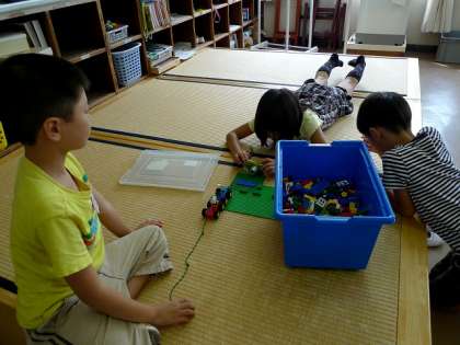 たんぽぽ組(担任:笠原教諭)は、予定の作業が終了してブロックで遊んでいます。完成したクルマをカメラで撮影している人もいます。
