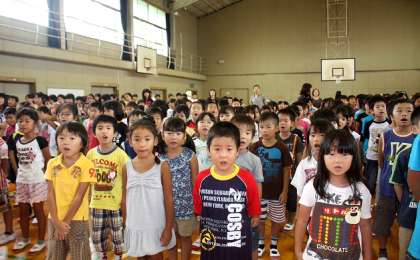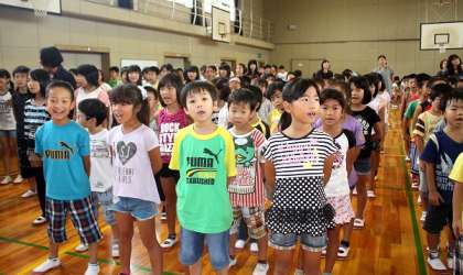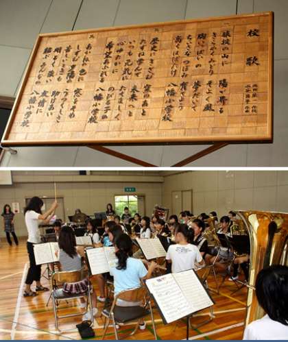 「♪ 〜苦しいときも 助け合い、明るく強い友情に、結ぶ みんなの八幡小学校〜」