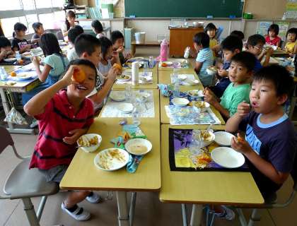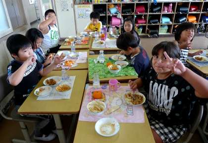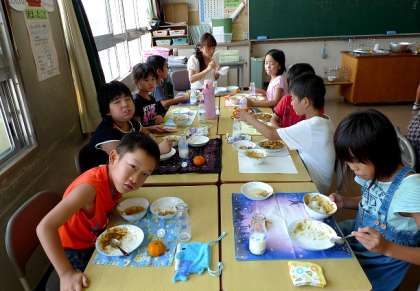こちら3年2組(担任:洞口教諭)の給食風景です。担任の先生も子どもたちのグループに入っての会食です。