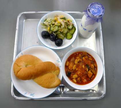 今日のメニューは、チキンビーンズ、ツナサラダ、クロスロールパン、牛乳、巨峰です。
