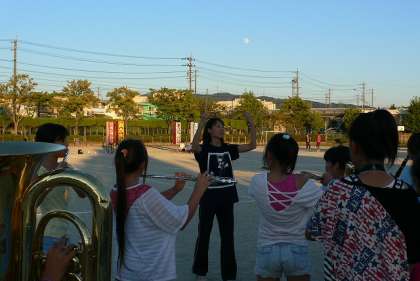 時計は午後5時をまわり、日もずいぶん傾いてきました。音楽室で練習をすませた音楽部員が運動場に出てきて、これから最後の音合わせ(リハーサル)が始まりました。