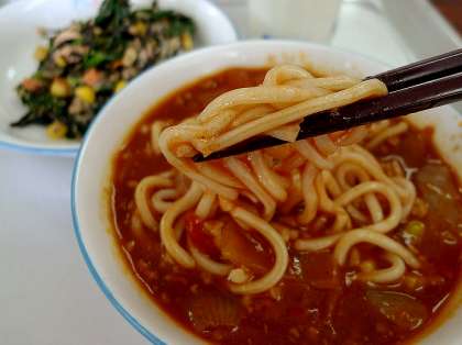 ひさしぶりのソフト麺です。相棒はミートソースです。