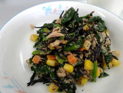 「ひじきサラダ」は、ひじきとほうれん草、オイルツナなどを豆腐マヨネーズと練りごまであえてあります。彩りよくにんじんやコーンも入れてあります。このサラダでカルシウムや鉄分などの栄養素をとることができます。