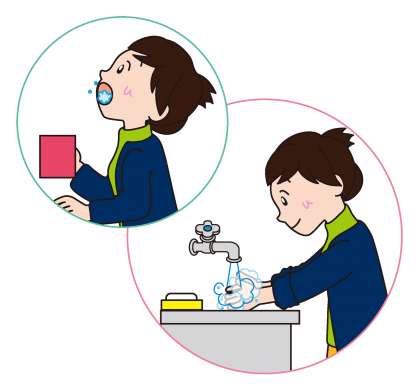 1:かぜ・インフルエンザと同様に、帰宅後・食前・トイレの後の手洗い
