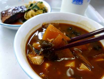 三枚おろしの切り身を素揚げした後に、砂糖、しょうゆ、みりんの甘口のタレで炊いて、鰹削り節であえます。鯖特有の臭みも消えて、味も濃く揚げてあるので小骨も食べやすくなっていました。