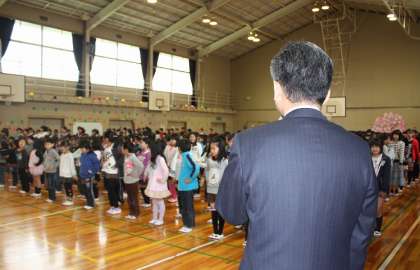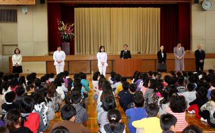 始業式に先だって、今回の人事異動で八幡小学校へ転任、育児休業から復帰した教職員を紹介する「着任式」が行われ、浅井校長より新しい職員が紹介されました。