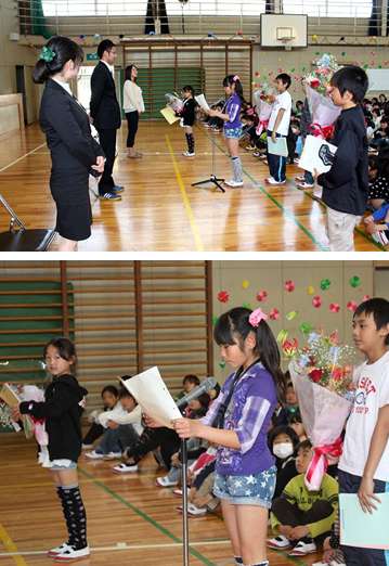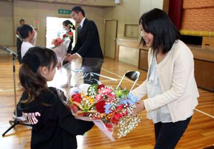 全校児童を代表して、伊勢谷さん(6年生)がお礼の言葉を述べ、それぞれの職員にゆかりのある児童が花束をプレゼントしました。