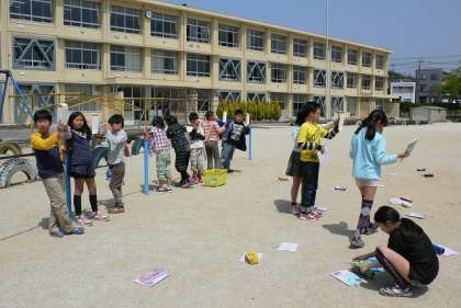 子どもたちは、加藤教諭が牛乳パックを再利用して制作した温度測定用のカバー(直射日光からガードする目的)を装着して、運動場の気温を測定していました。測定した気温は観察ノートに記録します。